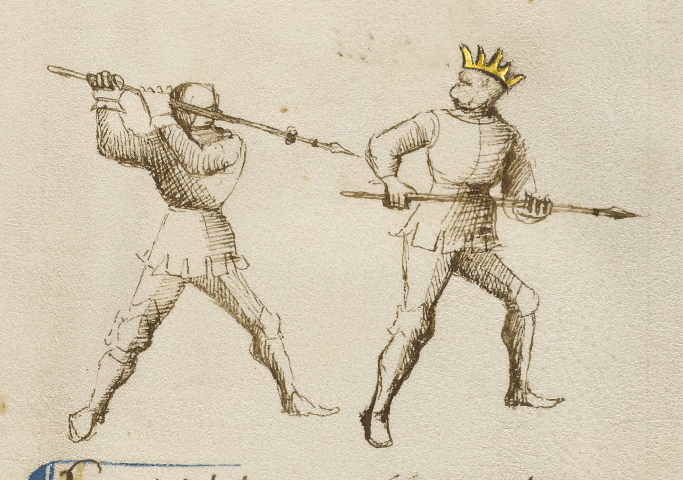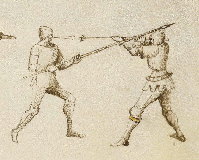 Der Abschnitt zum Speer in Rüstung ist der letzte Abschnitt in dem Getty-Manuskript, in dem das Kämpfen zu Fuß thematisiert wird; danach kommt das Kämpfen zu Pferd. Durch das “wie üblich” am Ende des Satzes bekomme ich den Eindruck, dass Fiore weiß, dass seine Schüler diese Verteidigung schon tausendmal gemacht haben (auch wenn sie es noch nicht mit dem Speer gemacht haben).