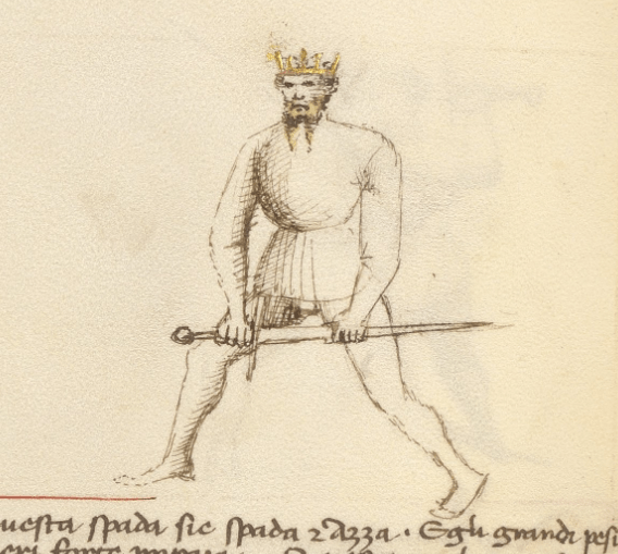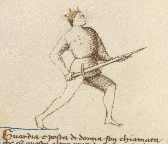 Getty-MS, Das Schwert in zwei Händen, Poste: “Ich stehe bereit, einen langen Stich auszuführen. Die größere Reichweite dieses Stichs entspricht der Länge meines Schwertgriffs. Ich bin recht nützlich, wenn mein Gegner und ich beide in Rüstung sind. Da ich nur eine kurze Länge meiner Spitze präsentiere, kann ich nicht getäuscht werden.”