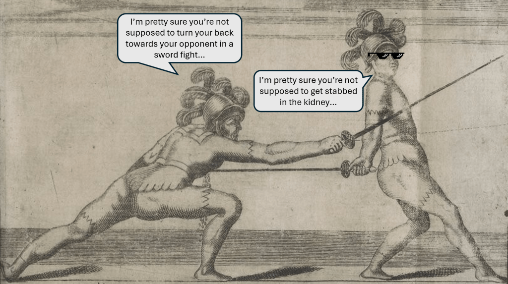 I greatly enjoyed the historical background information in the introduction and would recommend the book to someone interested in the subject based on that alone. This information set the stage for the treatise well and made Besnard’s last two chapters regarding pistol dueling seem less random than they might have otherwise. The fencing treatise, itself, is fairly concise with the English translation coming in at less than 100 pages in a reasonable font size. Besnard faces the same problem that everyone describing fencing in text does: it often takes a lot of words to describe an action that would be easy to demonstrate in person. Despite this, the treatise is clear, logically organized, and the descriptions of techniques are easy enough to imagine for a reader already familiar with fencing. I wish there were more pictures, but the three original image plates that depict fencing techniques are surprisingly sufficient to visualize the system. Aside from the quality of the fencing content, I also enjoyed what I felt was a sense of the historical author’s personality from the translation. Besnard regularly uses dramatic metaphors and colloquialisms and there are more than a couple of places where I got some “old man yells at cloud” vibes, which I chose to interpret as quaint!